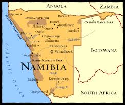 Namibia : (antes, África del Suroeste). Territorio de África austral, limitado por el Atlántico, Angola, Zambia, Botswana y la República Sudafricana, a la que perteneció de facto durante muchos años. La mayoría de los habitantes son bantúes; existen minorías de blancos y coloured. La capital es Windhoek. El país comprende, de N a S, la región de Ovanboland, con los salares de Etosha; el paisaje montañoso de Damaraland; el desierto costero de Namibia y, en el E, el Kalahari, otra región de acentuada pobreza. El clima es desértico, incluso en la costa, donde las aguas frías que ascienden a la superficie desde el fondo del océano (la corriente de Benguela) originan con frecuencia nieblas muy densas. Sólo el 0,8% de la superficie del país está dedicado a la agricultura, con cultivos de maíz, mijo y sorgo principalmente. En cambio, la ganadería es muy importante. Los recursos minerales son considerables: se encuentran diamantes en las arenas de la franja litoral y se explotan importantes minas de plomo y cobre (cuyo refino ha dado lugar a una industria metalúrgica significativa), así como de estaño, cinc, cadmio, vanadio y volframio. ¦ Historica Colonia alemana desde 1881 a 1915, la antigua África del Sur-oeste fue confiada por la Sociedad de Naciones a la Unión Sudafricana, en régimen de mandato, en 1920; de hecho está anexionada a ella desde 1947, a pesar de la decisión de la ONU (en 1966) de poner fin al mandato. En 1976 anunció la independencia del territorio para finales de 1978, previa celebración de elecciones. Pero la independencia no fue efectiva hasta 1990.